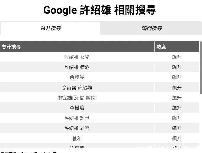 前TVB金牌绿叶许绍雄今日(28日)凌晨因癌症引发多种器官机能衰竭离世,享年76岁。消息传出后令众多网民感到惋惜。他的病危消息昨日(27日)曝光后,引发外界高度关注,关于其病情、就医地点、经典角色、家人及演艺圈好友的相关搜寻量迅速上升,其中热度最高的是多次在剧集中与他饰演父女关系的女艺人佘诗曼。港媒报导,许绍雄病危的消息昨日传出后,演艺圈多位好友相继前往医院探望,包括佘诗曼、黄子华、周润发、黎芷珊、吴卓羲、苗侨伟与妻子戚美珍、萧正楠与妻子黄翠如、黄智贤及黄宗泽等人。根据Google搜寻数据显示,“许绍雄”的关键字热度自昨日下午2时起明显上升,并在今早约11时其离世消息公布后达到最高峰。